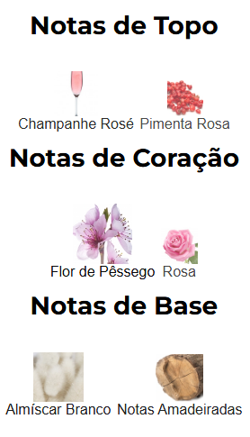As notas de topo são: Champanhe Rosé e Pimenta Rosa. As notas de coração são: Flor de Pêssego e Rosa. As notas de fundo são: Almíscar Branco e Notas Amadeiradas.