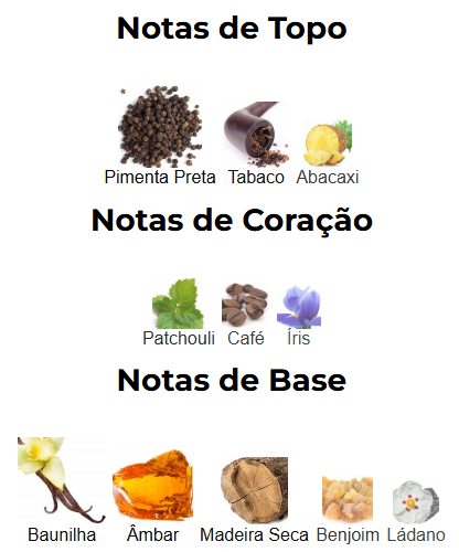 As notas de topo são: Pimenta Preta, Tabaco e Abacaxi. As notas de coração são: Patchouli, Café e Íris. As notas de fundo são: Baunilha, Âmbar, Madeira Seca, Benjoim e Ládano.
